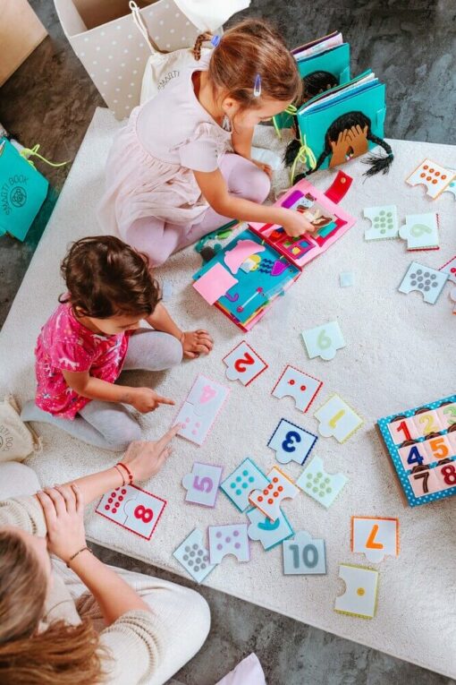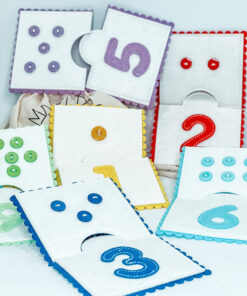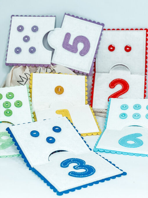 Finden von Zahlenpaaren: Bitten Sie das Kind, die Knöpfe zu fühlen und sie zu zählen. Dann sollen sie die gleiche Zahl auf der anderen Hälfte des Puzzles finden. Sobald sie das Puzzle zusammensetzen, überprüfen Sie die Genauigkeit des Ergebnisses.