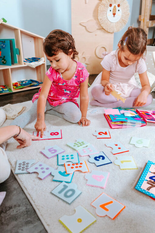 Zahlen aufsteigend oder absteigend sortieren: Ordnen Sie die Puzzleteile auf einer Oberfläche an. Sortieren Sie sie dann von der kleinsten zur größten und umgekehrt. Bei dieser Aktivität kann das Kind zum Zählen die Knöpfe verwenden.