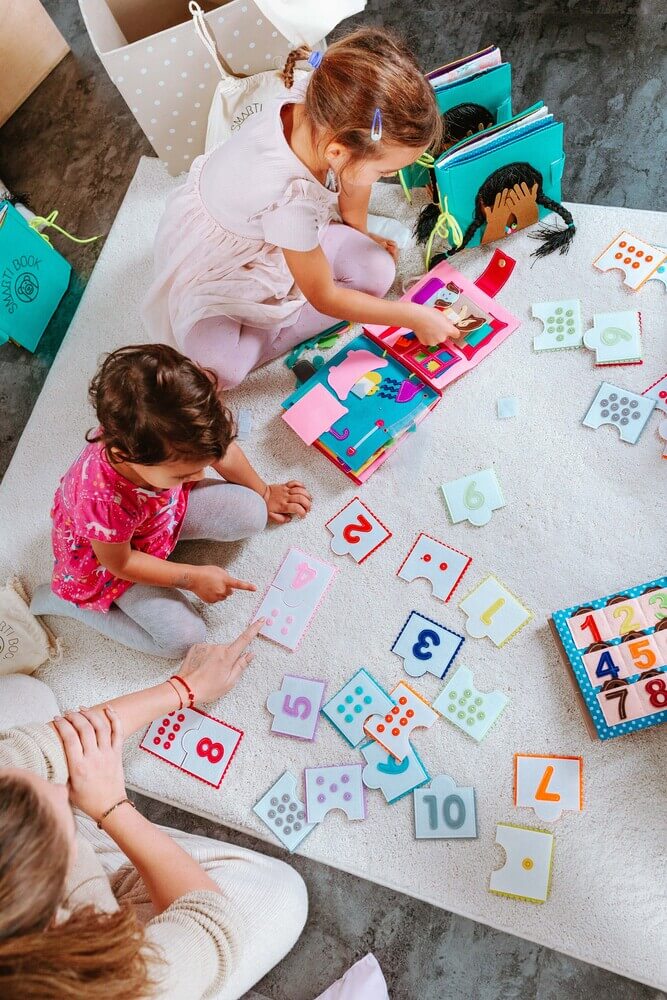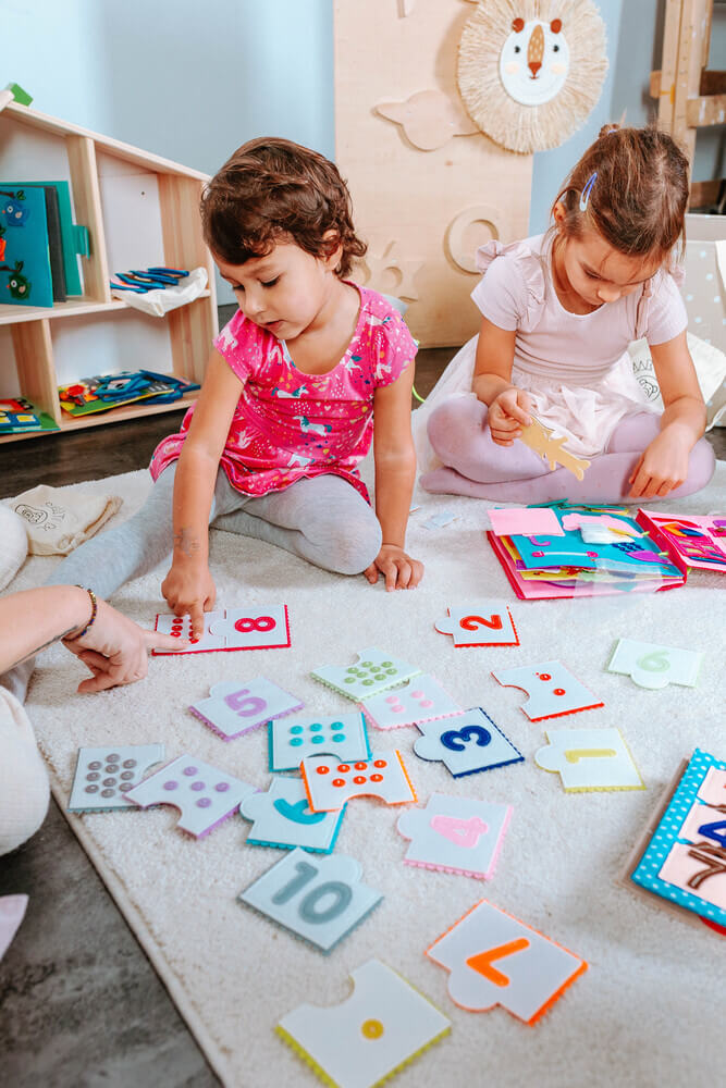 Zahlen kennenlernen: Ordnen Sie Puzzelpaare auf einer Oberfläche an. Dann lernt das Kind Zahlen durch das Zählen der Knöpfe kennen. Es ist wichtig, alle Knöpfe genau zu zählen.