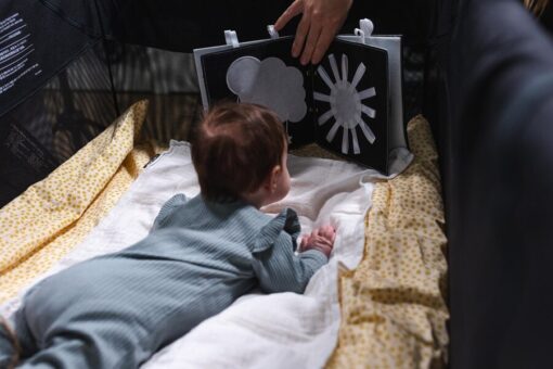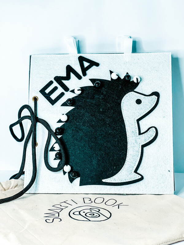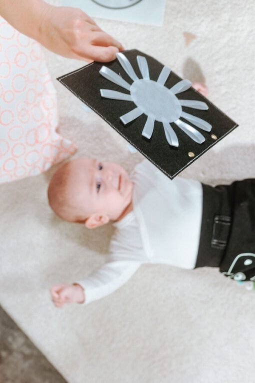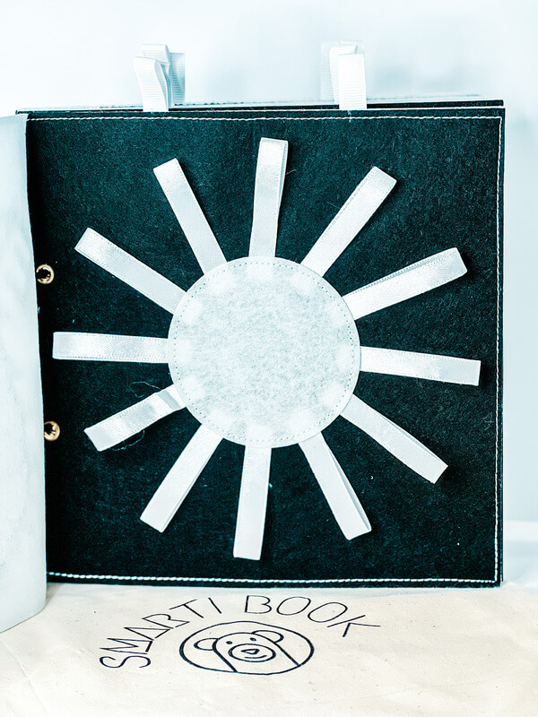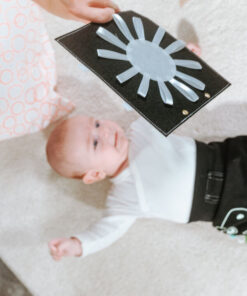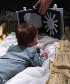 Das Black&White Book enthält 7 Seiten in einer Schwarz-Weiß-Farbkombination, weshalb es auch Kontrastbuch genannt wird, da Neugeborene dies zuerst unterscheiden. Zunächst unterscheidet ein Neugeborenes zwischen Hell und Dunkel und lernt, sich auf ein bestimmtes Objekt zu konzentrieren und seinen Blick darauf zu halten. Wussten Sie, dass je genauer die visuellen Informationen sind, die ein Neugeborenes erhält, desto mehr die Entwicklung des Gehirns angeregt wird? Daher wird empfohlen, die Umgebung des Kindes von Geburt an mit Schwarz-Weiß-Kontrasten zu füllen, damit das Kind frühe Signale aus der Umgebung erhält, die seine kognitive Entwicklung stimulieren. Das kontrastreiche Black&White Book ist eine ausgezeichnete Idee für das erste Spielzeug eines Babys. Alle Seiten des Büchleins sind abnehmbar und können horizontal an einem Kinderbett oder einer Spielmatte, an einem Kinderwagen oder einfach einzeln im Auto befestigt werden. Jede Seite bietet verschiedene Materialien, die das Baby berühren kann, wodurch die Sensorik gefördert wird. Wir haben das Büchlein für Neugeborene entworfen, um ihre sensorische und visuelle Entwicklung mit kontrastreichen Bildern von Tieren und Gegenständen zu fördern. Jede Seite ist mit verschiedene Materialien ausgestattet, die das Baby berühren kann, denn Babys genießen sie es sehr, noch unbekanntes wie neue Bilder und Materialien zu erkunden.