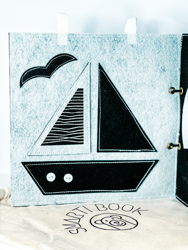 SEGELBOOT: Ein großes Segelboot voller Schwarz-Weiß-Kontraste. Das Kind kann den Unterschied der Segel ertasten. Unten sind ebenfalls auch noch zwei Knöpfe angebracht.
