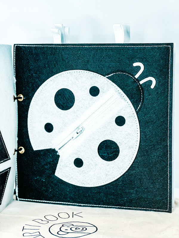 MARIENKÄFER: Ein etwas ungewöhnlicher schwarz-weißer Marienkäfer hat nicht nur schwarze Punkte, durch die das Kind einen Finger schieben kann, sondern auch einen Reißverschluss. Der Reißverschluss erzeugt ein sehr interessantes Geräusch und ist auch hervorragend zum Anfassen.