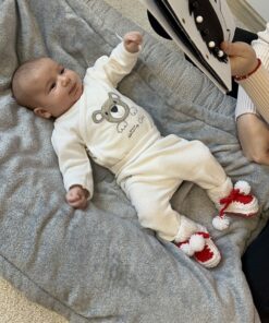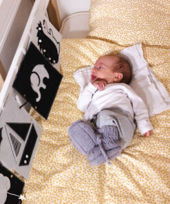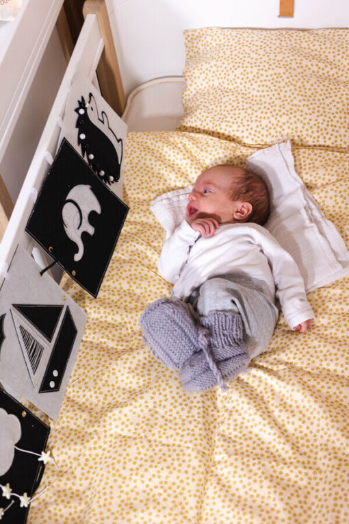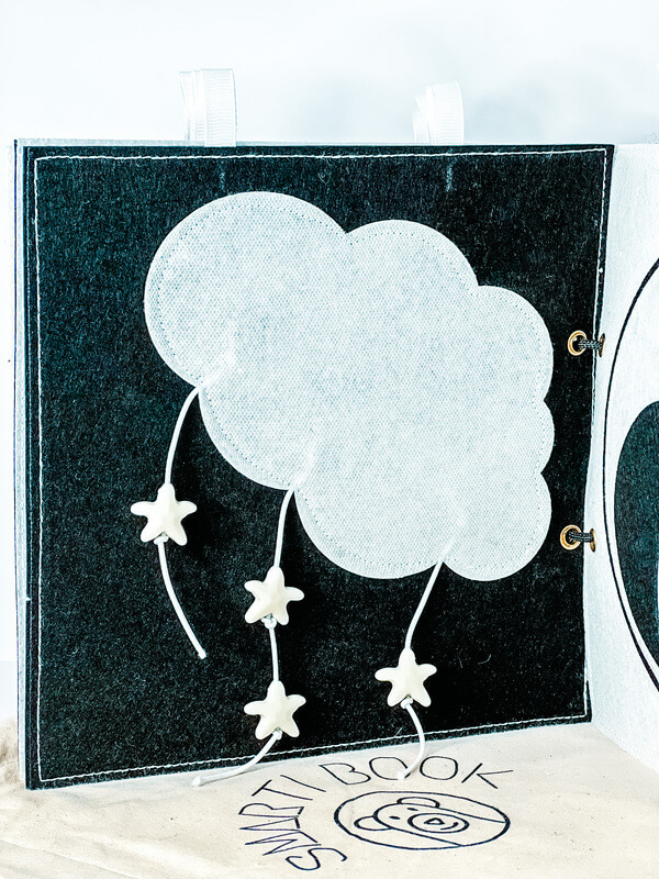 WOLKE: Die Wolke ist großartig zum Anfassen, da sie ein Netz über dem Filz hat, das auch ein sehr angenehmes Geräusch für Neugeborene erzeugt (ähnlich wie Rascheln). Zusätzlich hängen Schnürchen mit Sternen von der Wolke herab. Neben dem Beobachten kann das Baby auch alles berühren.